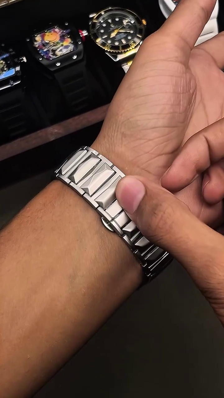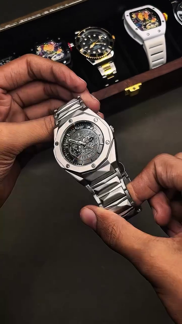The first thing you’ll notice is the iconic octagon-shaped dial, crafted with a premium metallic finish that delivers a powerful and masculine look 🖤⚙️. The exposed screw detailing around the bezel adds an industrial luxury vibe, while the detailed chronograph sub-dials bring a sophisticated, high-performance aesthetic inspired by elite timepieces.