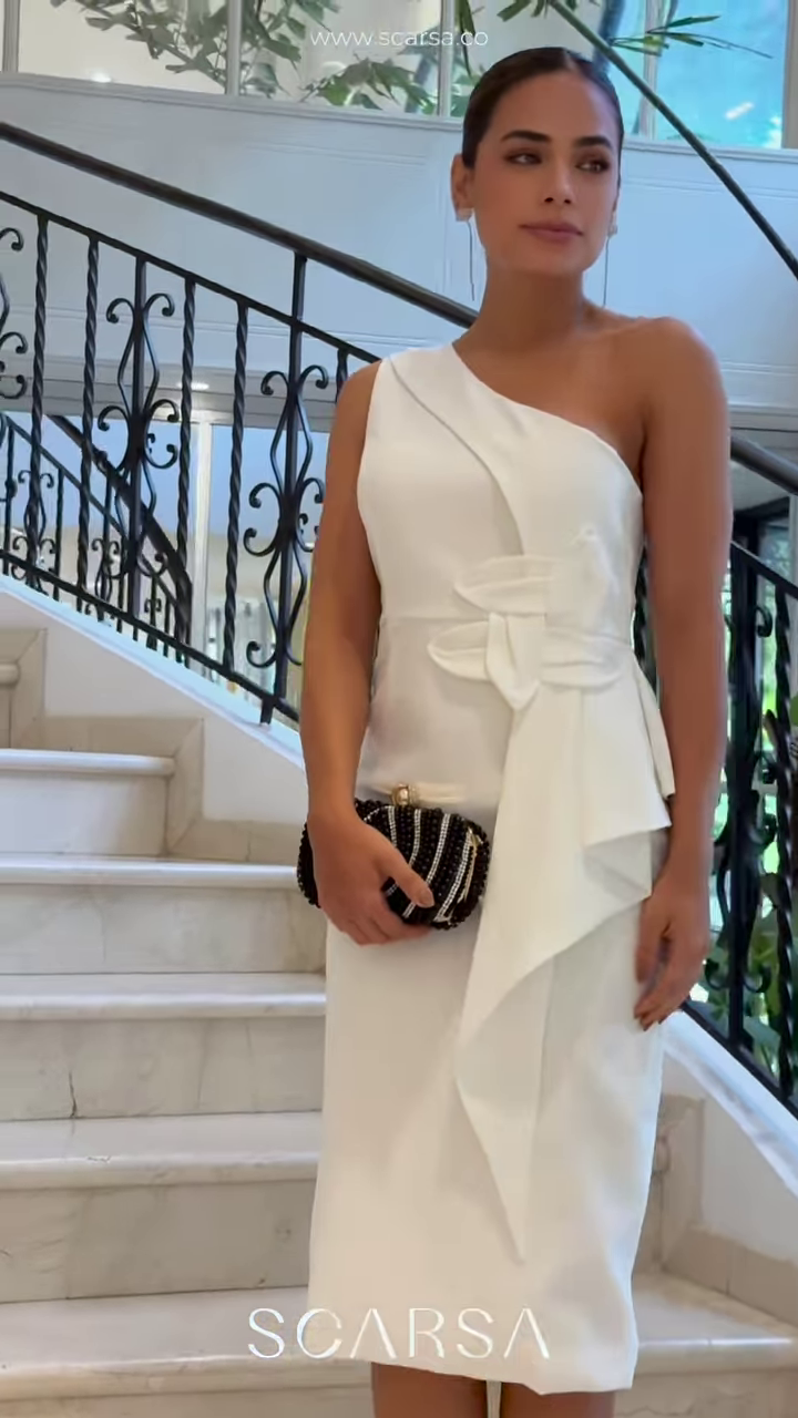 - 🤍 Beige Off-Shoulder Midi Dress – Soft structure and romantic pleats