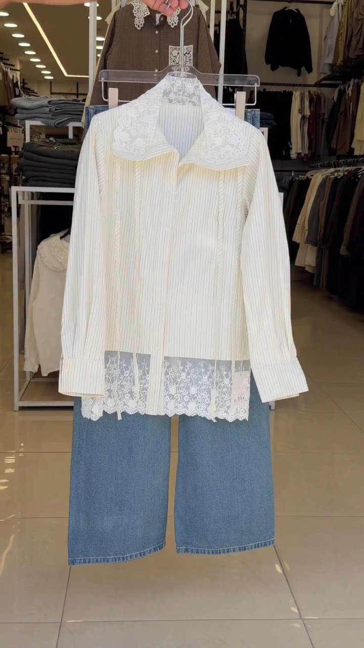 β¨ Elegant textured loose-fit shirt with delicate lace detailing