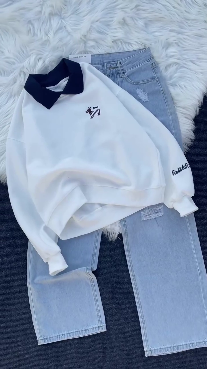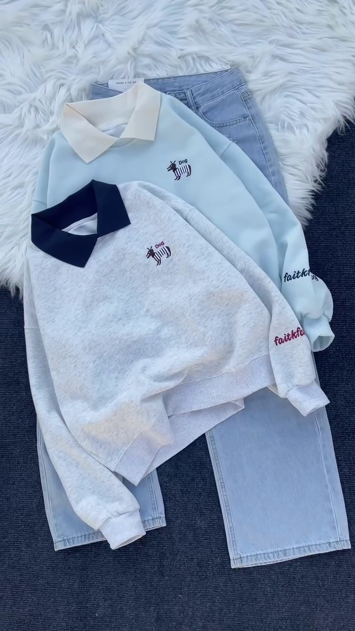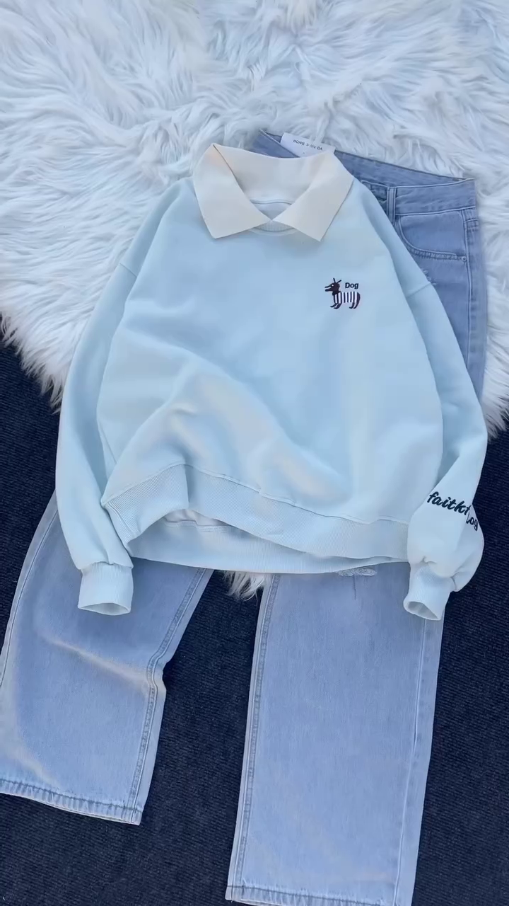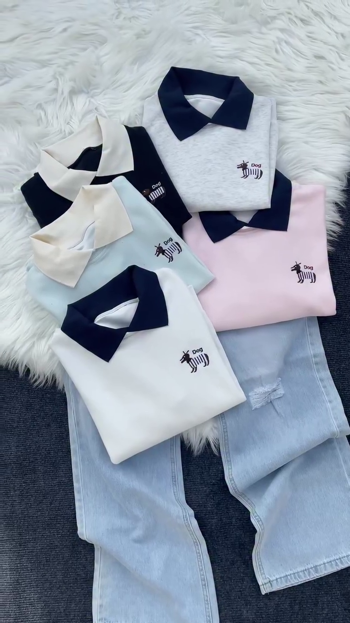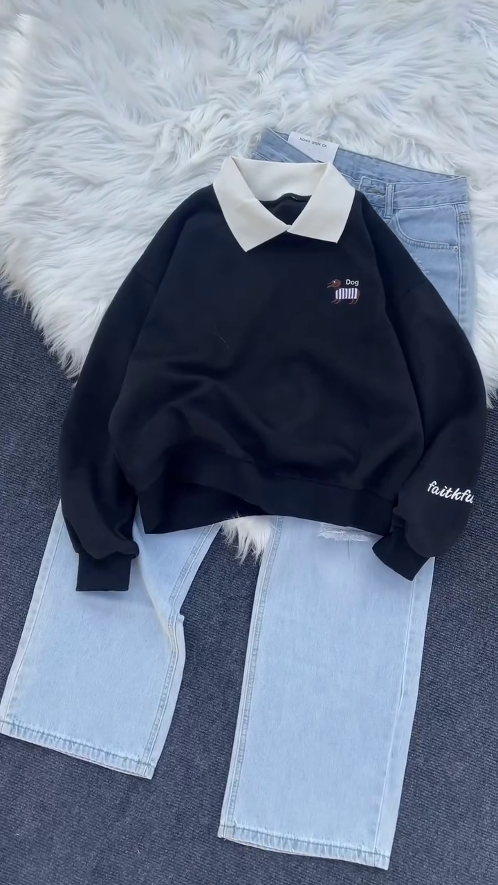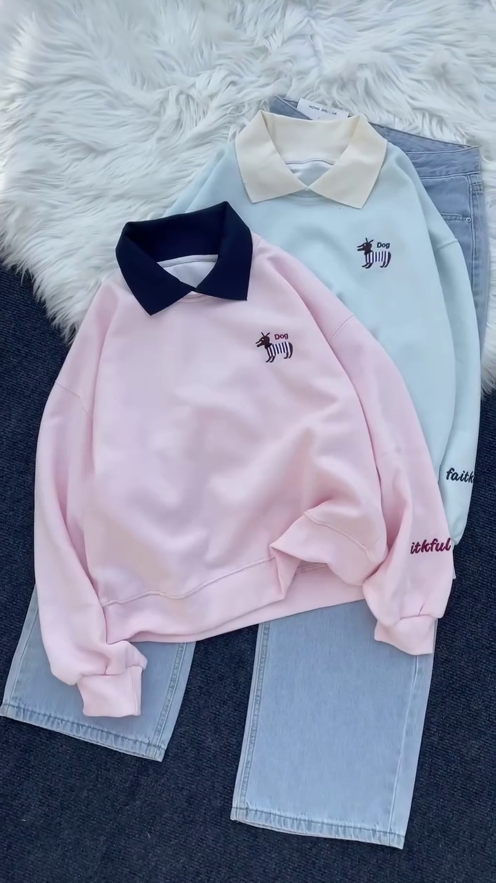 The standout feature is its stylish contrast collar design, which gives the sweatshirt a smart, polo-inspired look while keeping it casual and trendy. The adorable embroidered dog logo adds a playful personality without overpowering the clean aesthetic. It’s subtle, cute, and perfect for everyday styling. πŸ•πŸ’«