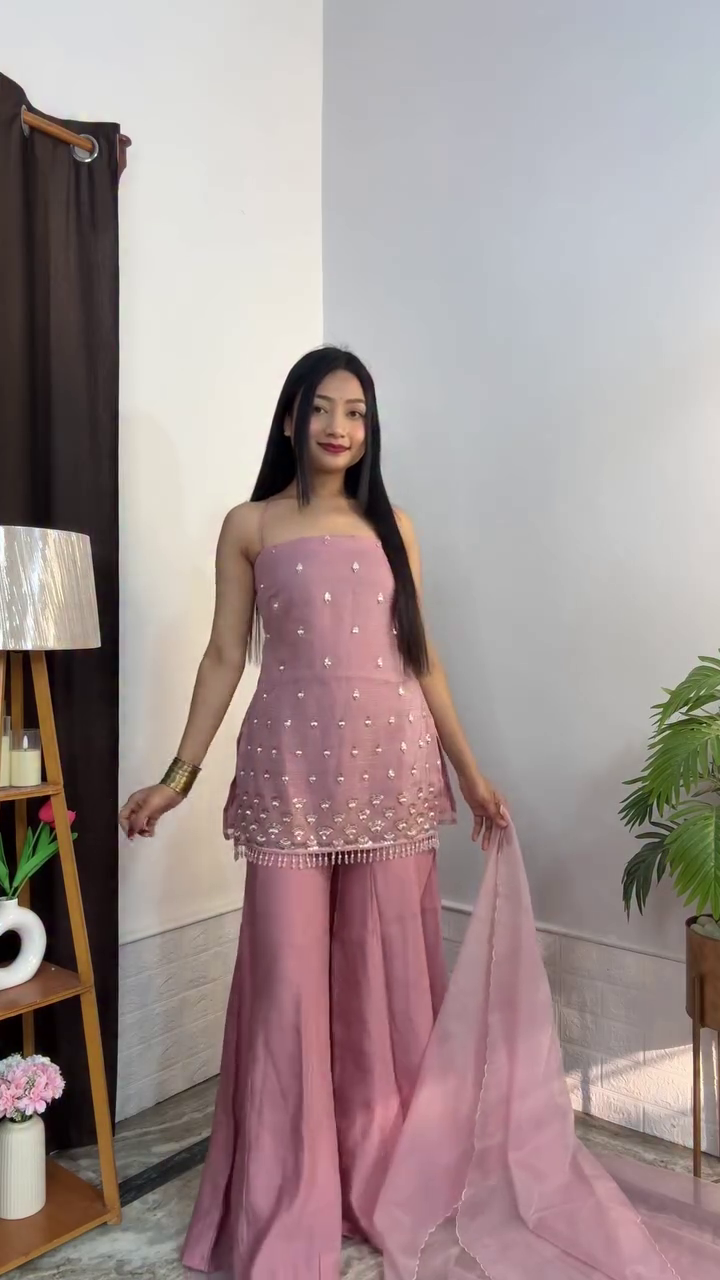 The kurta is adorned with intricate handwork detailing, adding a luxurious texture and shimmer to the soft light pink base ✨. Paired with a matching dupatta, this set creates a complete ensemble that radiates sophistication, making it perfect for festive occasions, weddings, or casual celebrations 🌷. The straight-fit design ensures a sleek, contemporary look while remaining effortlessly elegant.