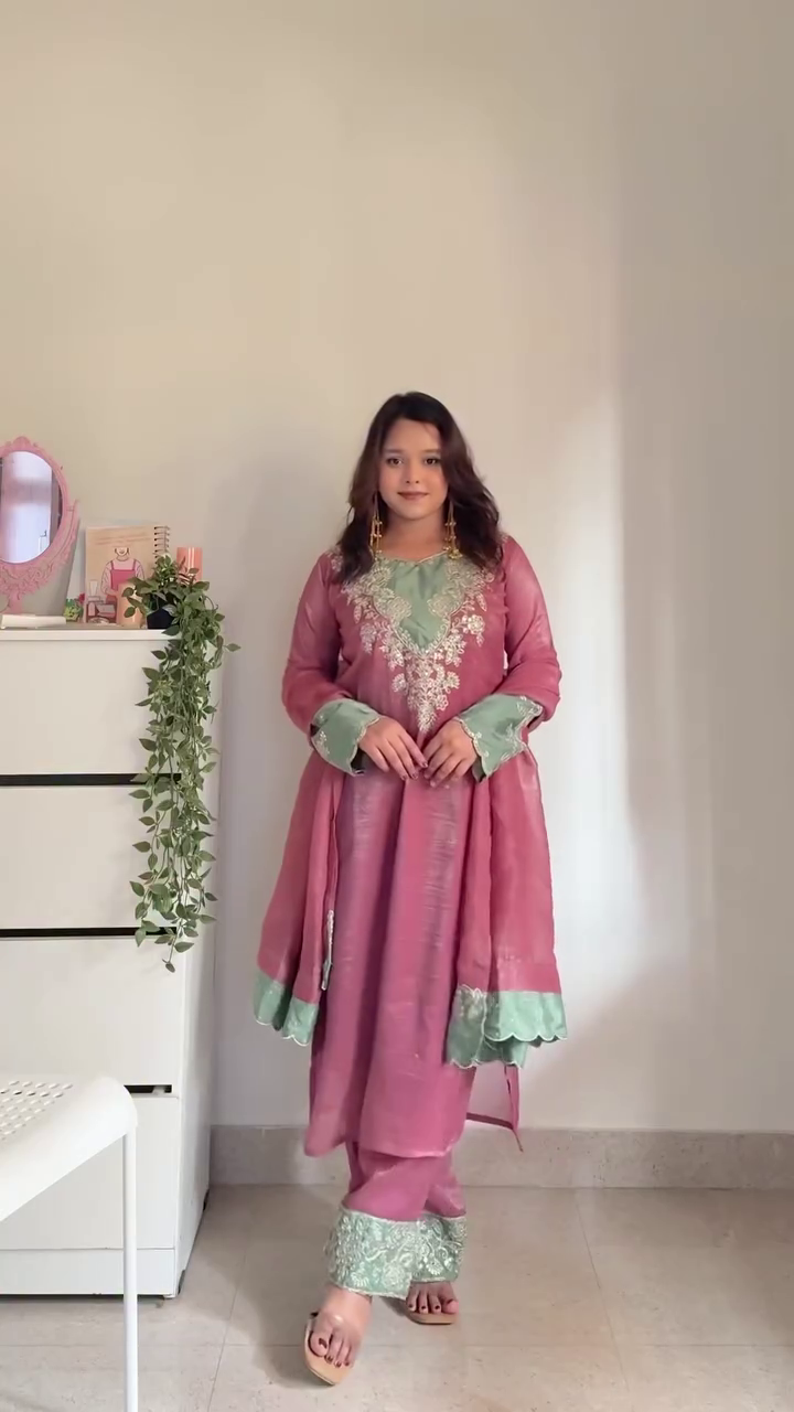 The rich mauve base exudes understated luxury, while the refreshing mint green accents create a graceful contrast πΏ. Intricate embroidery detailing on the neckline adds a statement of elegance and artistry, enhancing the overall look with delicate finesse π€. The scalloped mint borders on the sleeves and hemline provide a refined finishing touch that makes this outfit truly stand out.