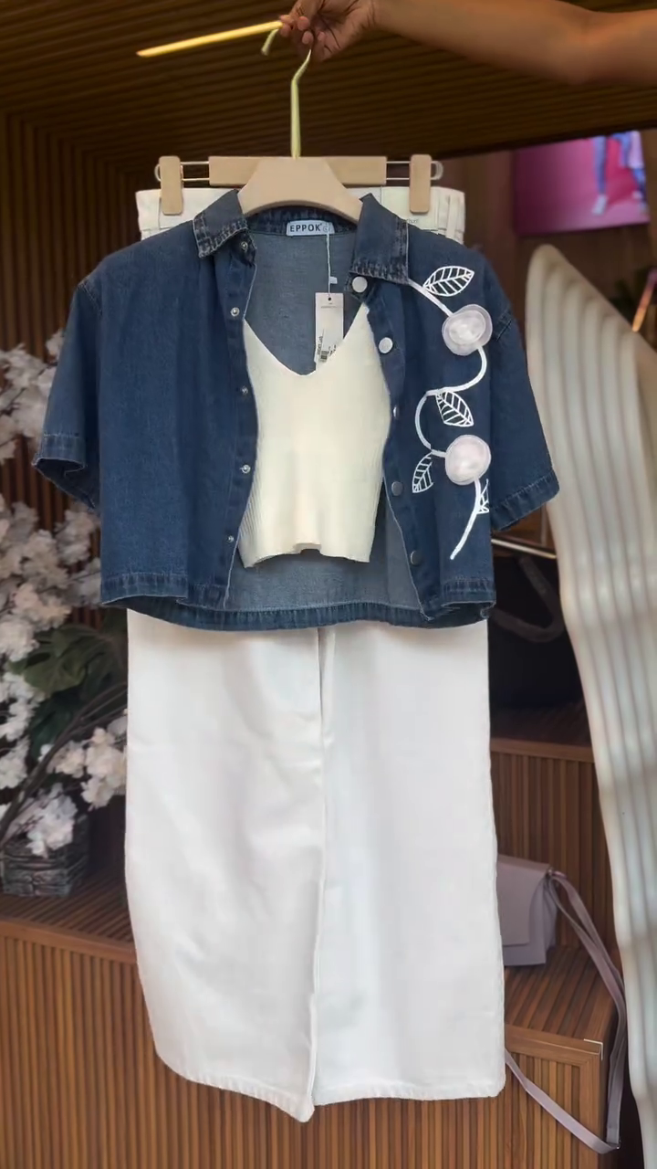 A denim crop top jacket featuring embroidered flower details paired with a white tank top and trousers is the ultimate combination of casual elegance and playful style πŸ’™πŸ€πŸ’. This ensemble merges timeless denim with feminine embroidery, creating a versatile outfit that balances structure, comfort, and charm. Ideal for casual outings, brunches, or smart-casual events, it’s a look that effortlessly stands out without trying too hard.