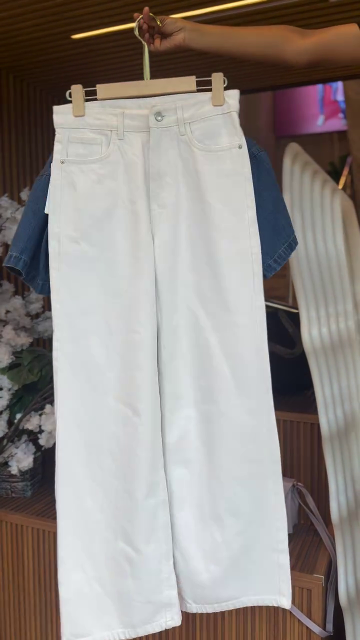 The denim crop jacket is the centerpiece of the outfit πŸ‘–πŸ’«. Its cropped length adds a youthful, modern touch while allowing the white tank underneath to peek through, providing a clean and bright contrast. The embroidered flower details inject personality and delicate artistry into the ensemble 🌸. Subtle floral embroidery can soften the rugged nature of denim, making the outfit feminine and stylish without being over the top. The structured denim also adds a layer of sophistication, elevating the casual tank-and-trouser combination.