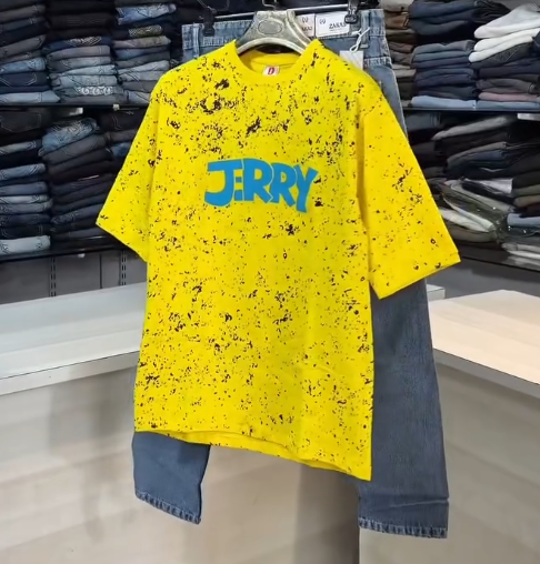 The bright yellow oversized T-shirt instantly grabs attention with its unique paint-splatter effect, giving it a raw, urban vibe π¨β‘. The bold βJERRYβ graphic print on the front adds a fun, cartoon-inspired touch that makes this tee perfect for relaxed, trendy styling. Made from premium-quality breathable cotton fabric, it feels soft on the skin and keeps you comfortable all day long π¬οΈπ. The oversized fit ensures a relaxed drape, making it ideal for everyday wear, travel, hangouts, or casual street looks.