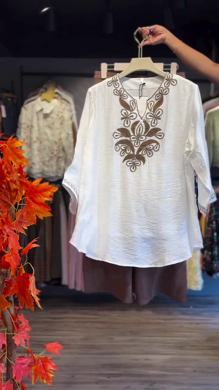 The beautiful ivory kurta features intricate brown embroidery around the neckline, creating a striking yet elegant focal point 🤎. The delicate floral-inspired pattern adds depth and artistry without overpowering the minimalist base. With its soft V-neckline and relaxed silhouette, the top drapes effortlessly for a flattering and comfortable fit.