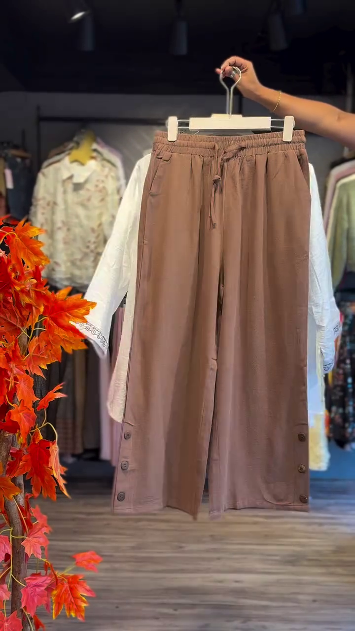 Paired with coordinated mocha-toned wide-leg pants, this set offers the perfect balance of structure and ease 🤍🤎. The elasticated waistband with adjustable drawstring provides a flexible, secure fit, while side button accents at the hem add a modern touch. The flowy silhouette of the pants complements the kurta beautifully, creating a balanced and elegant outfit.