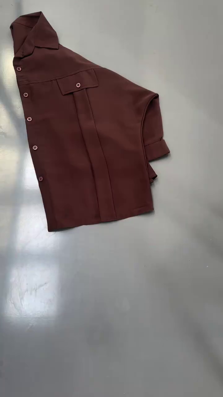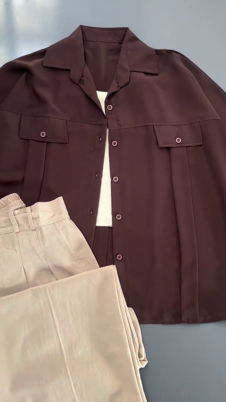 Complementing the trousers is a dark brown button-up shirt 🀎 β€” a rich, warm shade that adds depth and contrast to the lighter beige. The structured collar and tailored fit bring refinement, while the smooth fabric ensures a comfortable and flattering drape. The button-down design allows flexible styling: wear it fully buttoned for a sharp, professional appearance πŸ’Ό or slightly open at the neckline for relaxed sophistication.