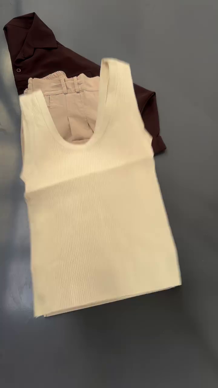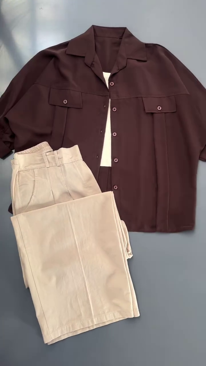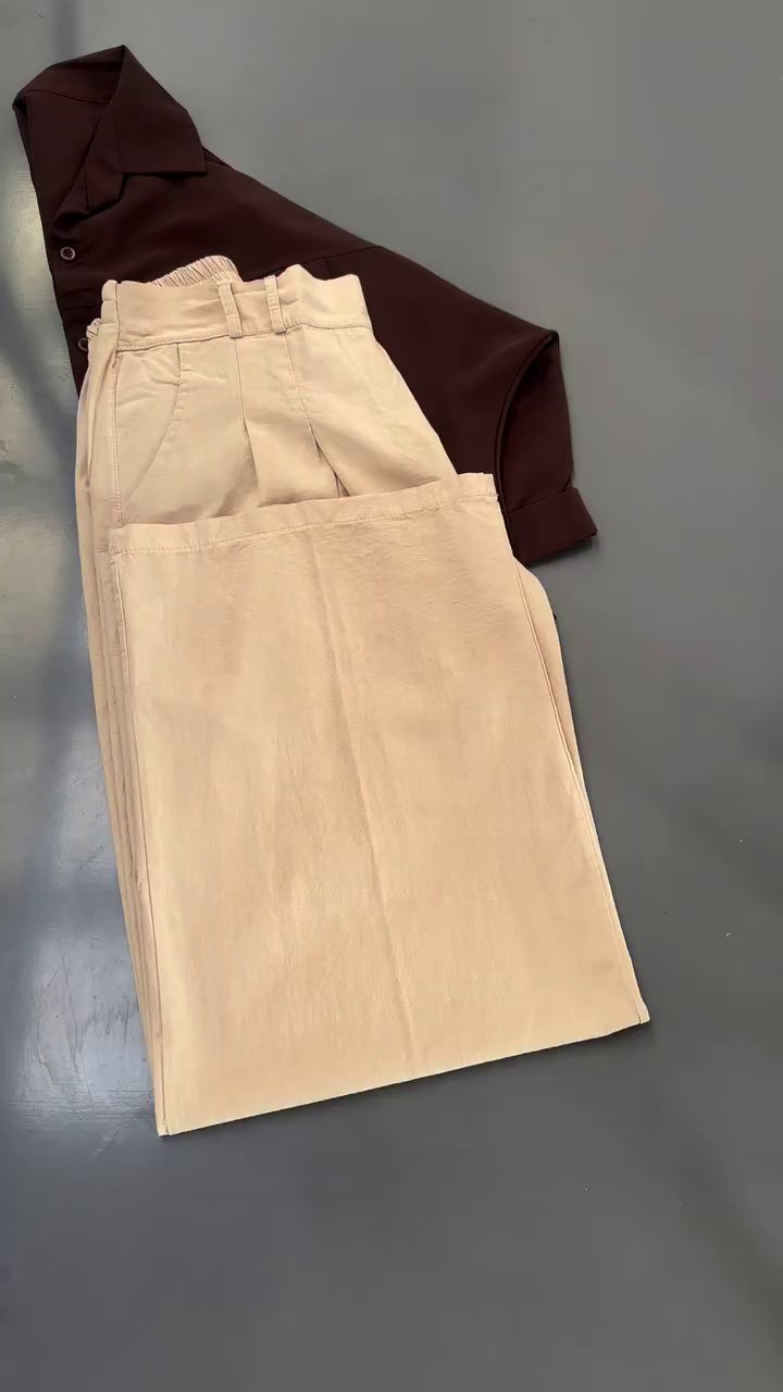 Step into refined sophistication with this beautifully balanced ensemble featuring beige wide-leg pleated trousers paired with a dark brown button-up shirt 🀎. A perfect fusion of warm earth tones and tailored silhouettes, this outfit is designed for the modern woman who values timeless style with a contemporary edge.