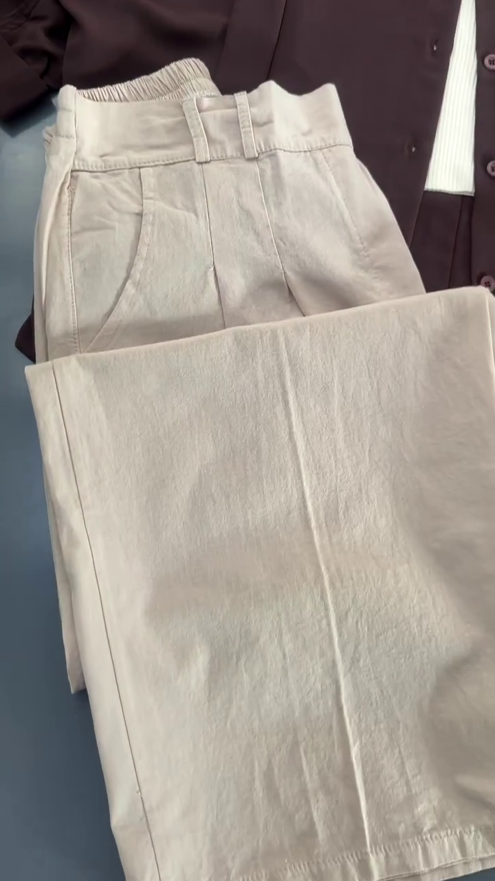 • πŸ‘– High-waisted beige wide-leg trousers with elegant pleats