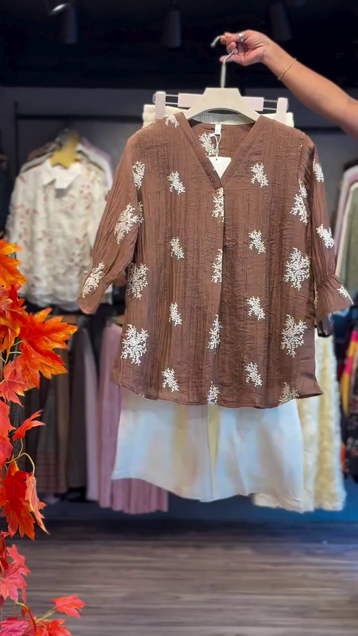 The textured mocha brown top features a relaxed silhouette with a flattering V-neckline 🌿. Adorned with scattered white floral-inspired embroidery, it creates a beautiful contrast that feels minimal yet eye-catching. The crinkled fabric texture adds depth and character, giving the outfit a relaxed, contemporary vibe. Three-quarter sleeves with gentle flare detailing enhance the overall flowy aesthetic.