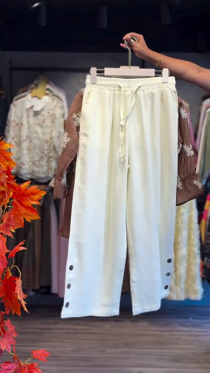 Paired with ivory wide-leg pants 🤍, this set strikes the perfect balance between structure and comfort. The pants feature an elasticated waistband with adjustable drawstring for a flexible fit, ensuring all-day ease. Stylish button accents near the hem add a modern design element, elevating the look from simple to standout 💫.
