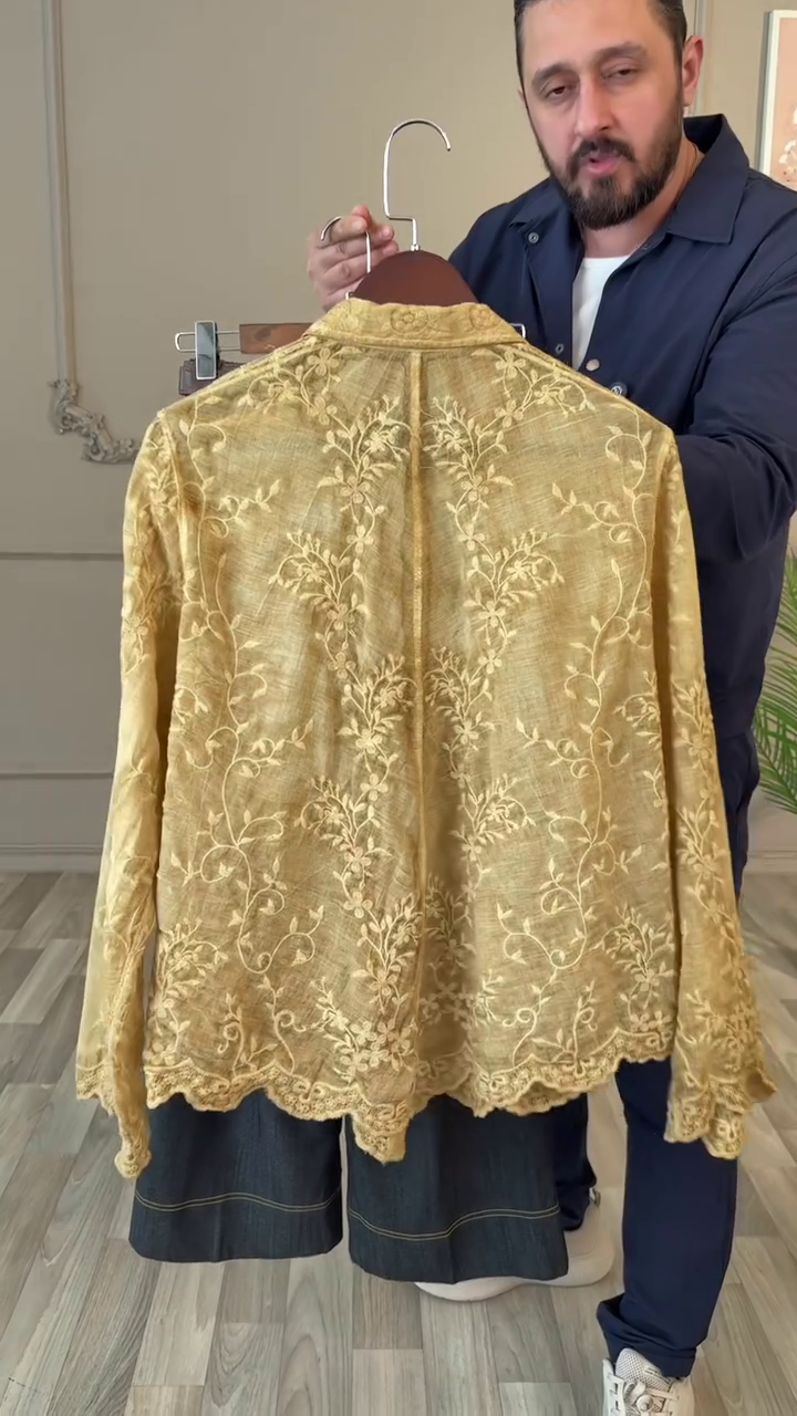 The highlight of this ensemble is the yellow embroidered lace shirt, designed to add a soft yet striking statement to your outfit. The vibrant yellow tone brings warmth and brightness, instantly uplifting your overall look. Delicate lace detailing combined with intricate embroidery creates a sophisticated texture that adds depth and elegance to the shirt. These fine details make the piece visually appealing while maintaining a graceful and polished aesthetic.
