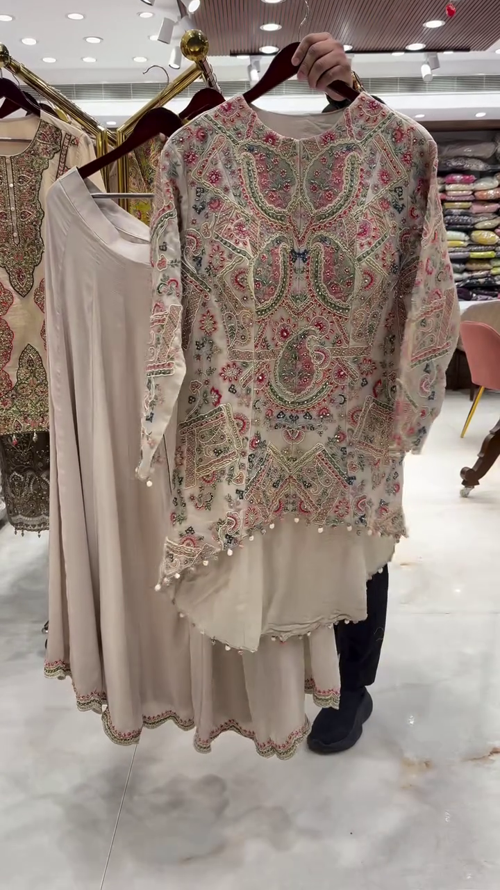 Accessorize with subtle jewelry, such as earrings, bangles, or a delicate pendant, to highlight the embroidery without overpowering it. Footwear like embellished flats, heels, or sandals further enhances the outfit’s refined aesthetic, while a complementary dupatta or scarf can add additional layers of style and sophistication.