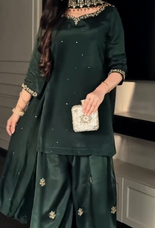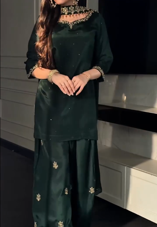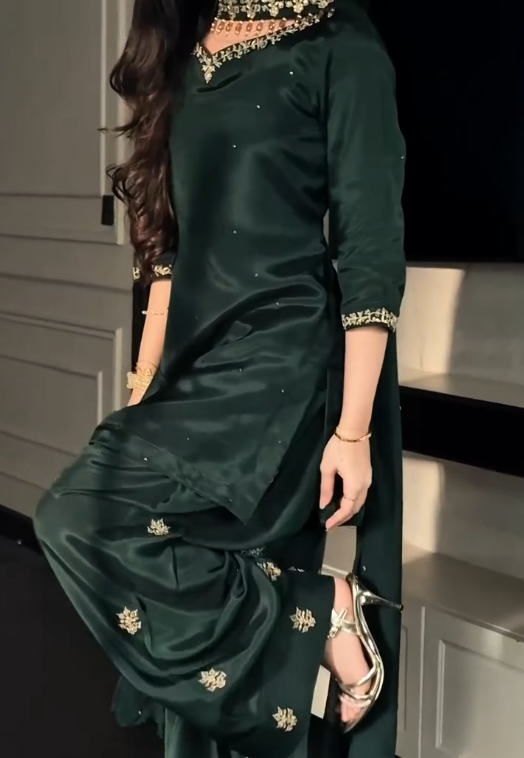 Crafted from a premium silk blend fabric, the suit offers a soft sheen that instantly elevates its overall appeal. The rich green hue symbolizes freshness, prosperity, and poise, making it an eye-catching yet graceful color choice. The straight-cut silhouette enhances the body’s natural lines while maintaining comfort and modesty, creating a flattering and versatile look suitable for all age groups.