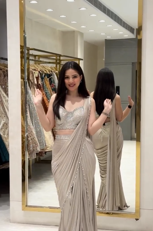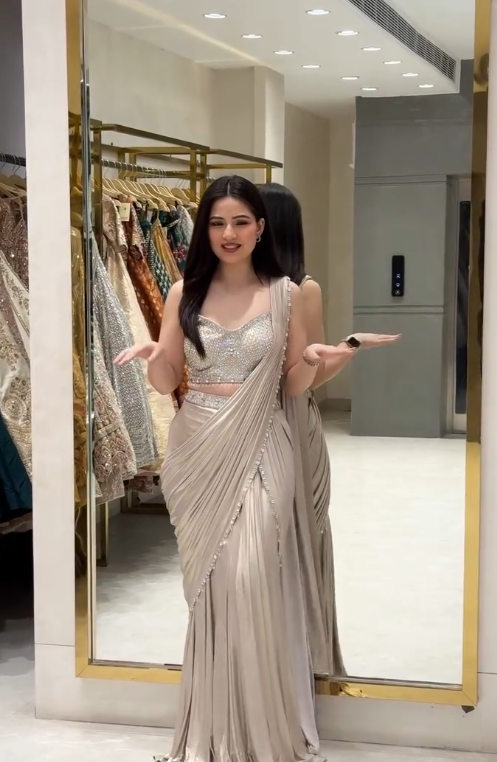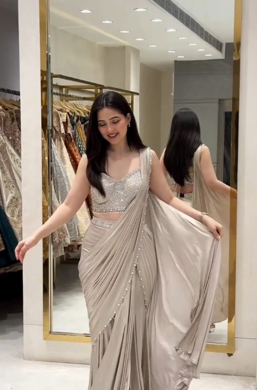 The draped saree is expertly pre-stitched for effortless elegance, allowing you to achieve the iconic saree silhouette in minutes. Crafted from luxurious fabrics like georgette, chiffon, or silk blends, it flows gracefully while maintaining structure and poise. The saree’s soft base fabric creates a canvas for the blouse, highlighting the intricate embellishments and elevating the overall glamour of the outfit.