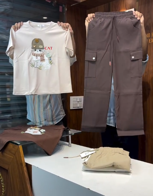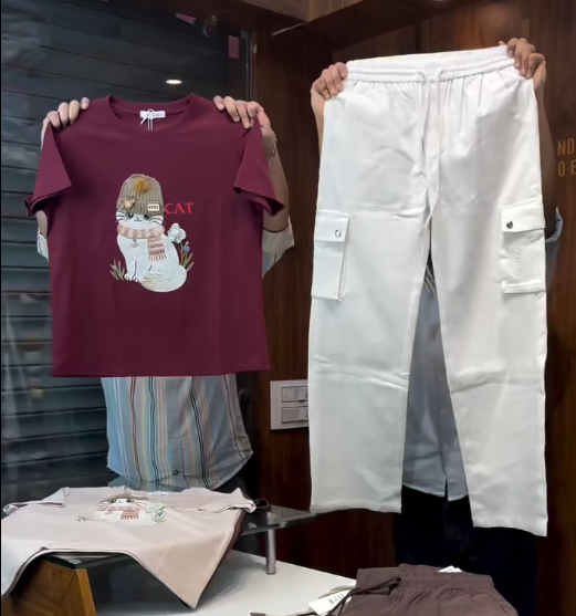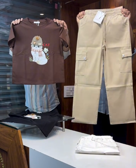 The soft pink crewneck t-shirt instantly brightens the outfit, offering a youthful and cheerful vibe. Its cartoon cat graphic adds a quirky, lighthearted element that expresses individuality without feeling over the top. Crafted from breathable cotton or a cotton blend, the t-shirt ensures comfort for all-day wear, while the relaxed crewneck silhouette gives a modern, laid-back fit suitable for layering or wearing solo.