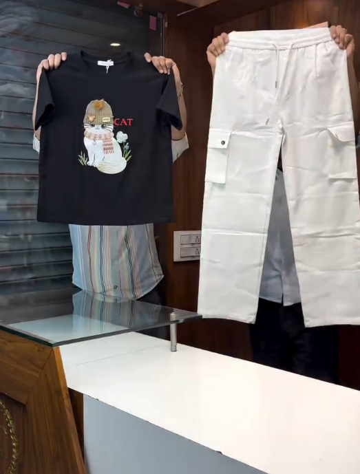 Playful Edge: Pink Cartoon Cat Tee with Black Cargo Pants