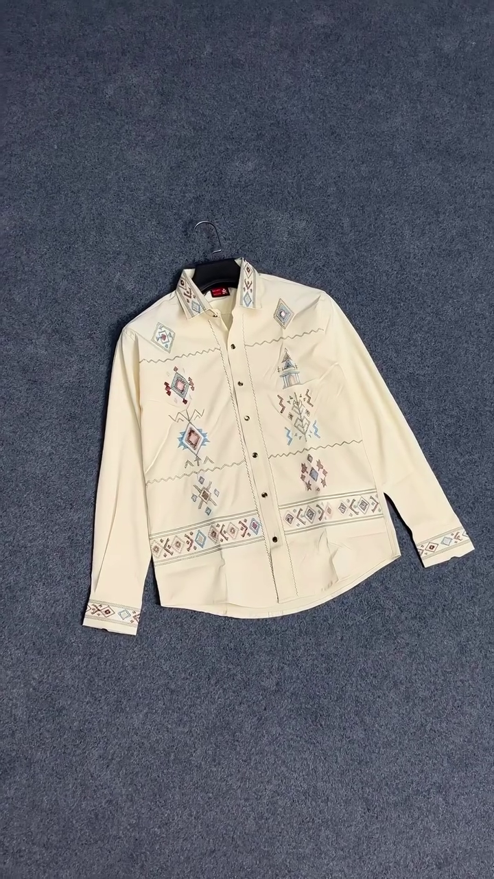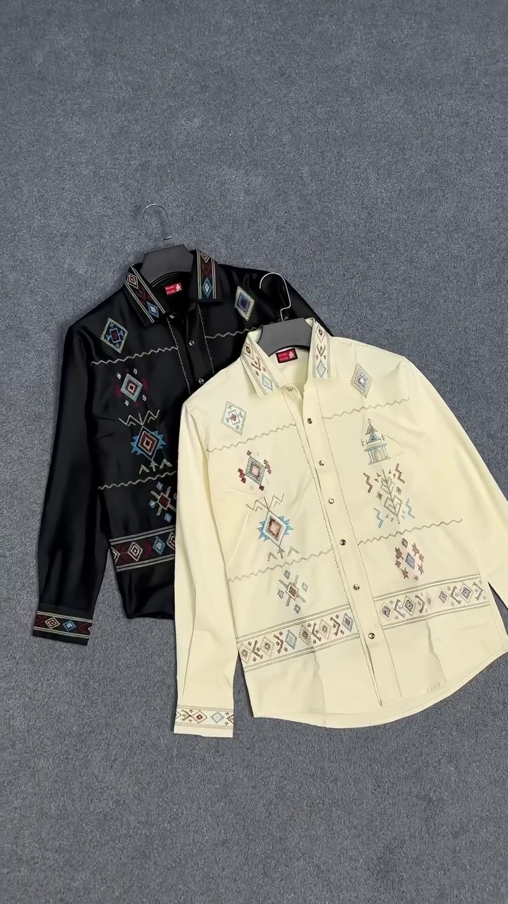 Elevate your wardrobe with a long-sleeved shirt that seamlessly blends classic tailoring with intricate western-style geometric embroidery. This statement piece is perfect for casual gatherings, cultural events, creative work settings, or evening outings where you want to showcase style with subtle sophistication.