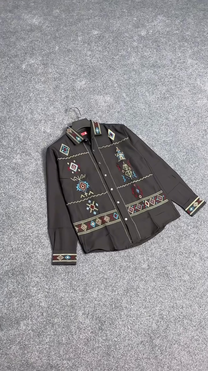 The shirt’s standout feature is its detailed geometric embroidery, which adorns the front panel, cuffs, or shoulders depending on the design. The embroidery adds texture, dimension, and a touch of artisanal craftsmanship, giving the shirt a unique personality while keeping it versatile. The long sleeves and structured collar provide a polished silhouette, balancing the decorative elements with clean lines for a refined overall look.